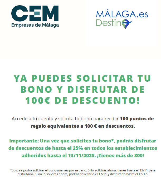 Se trata de una oportunidad única para disfrutar (o descubrir) productos y servicios malagueños de más de 800 establecimientos. Para ello sólo tienes que solicitar tu bono. Recuerda que habrá tres categorías en las que aprovechar los descuentos: